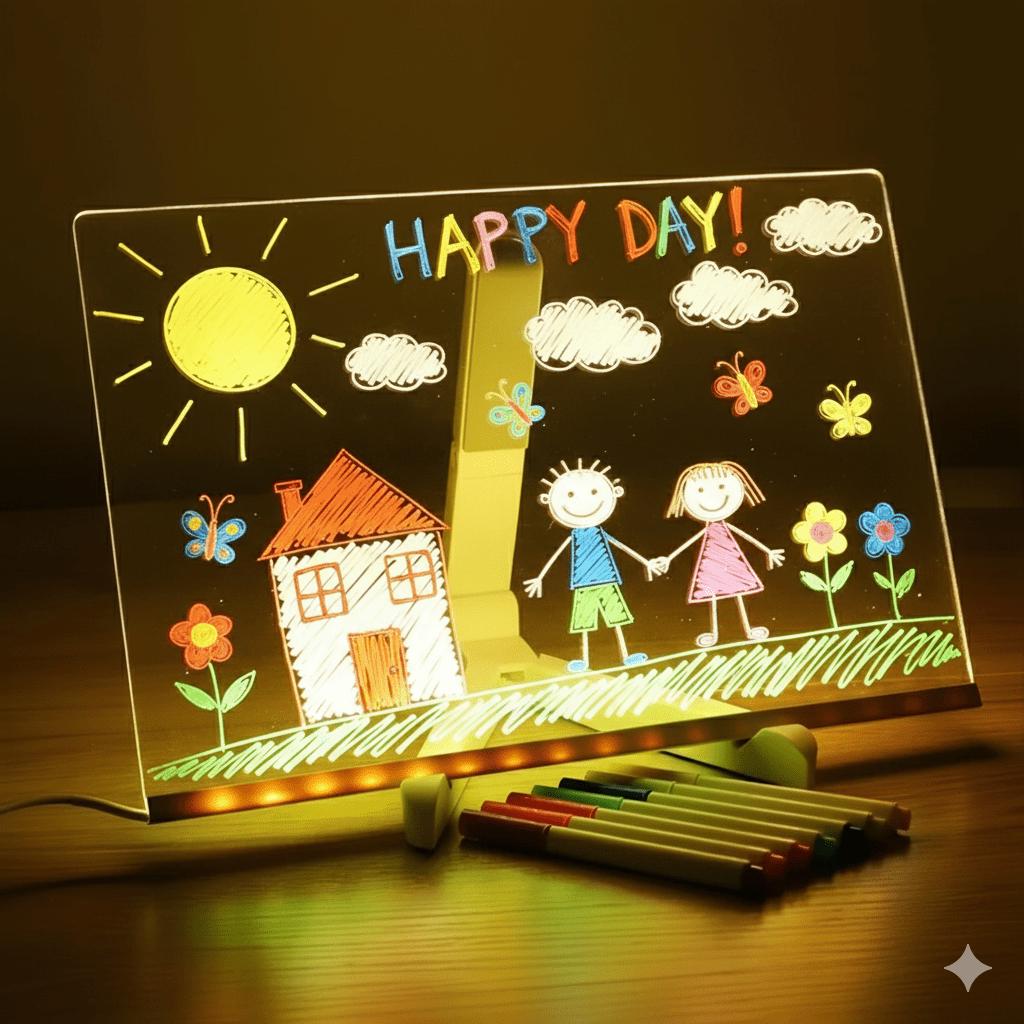 Transforme o quarto dos pequenos em um espaço mágico de luz, arte e imaginação! O BrightBoard™ Kids Edition é uma lousa/quadro de anotações LED colorido que permite às crianças desenhar, escrever e criar com luz — uma forma divertida e educativa de aprender brincando!